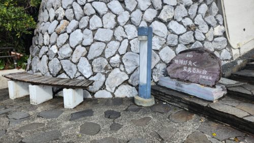 実は裏側から車で真横まで行けますが、駐車場300円取られます(宿泊すればただだとは思う。旅館の駐車場なんです)。ここなら無料。まぁ無料だよね。約30mくらい(標高30mです)上がるので5分から10分くらい階段を登り続けます。疲れますよ・・・まぁ良いけど。(初めてじゃないし)