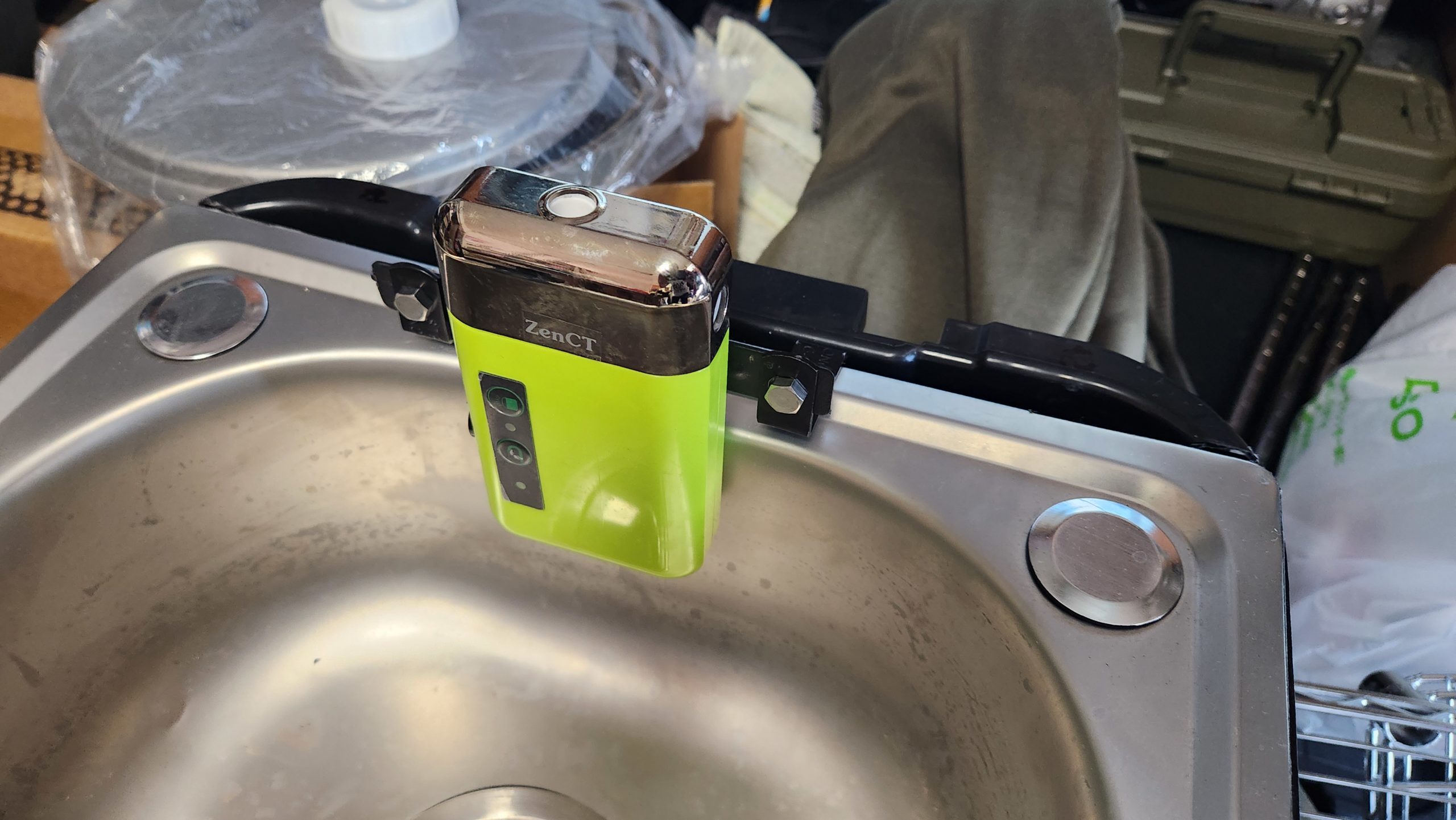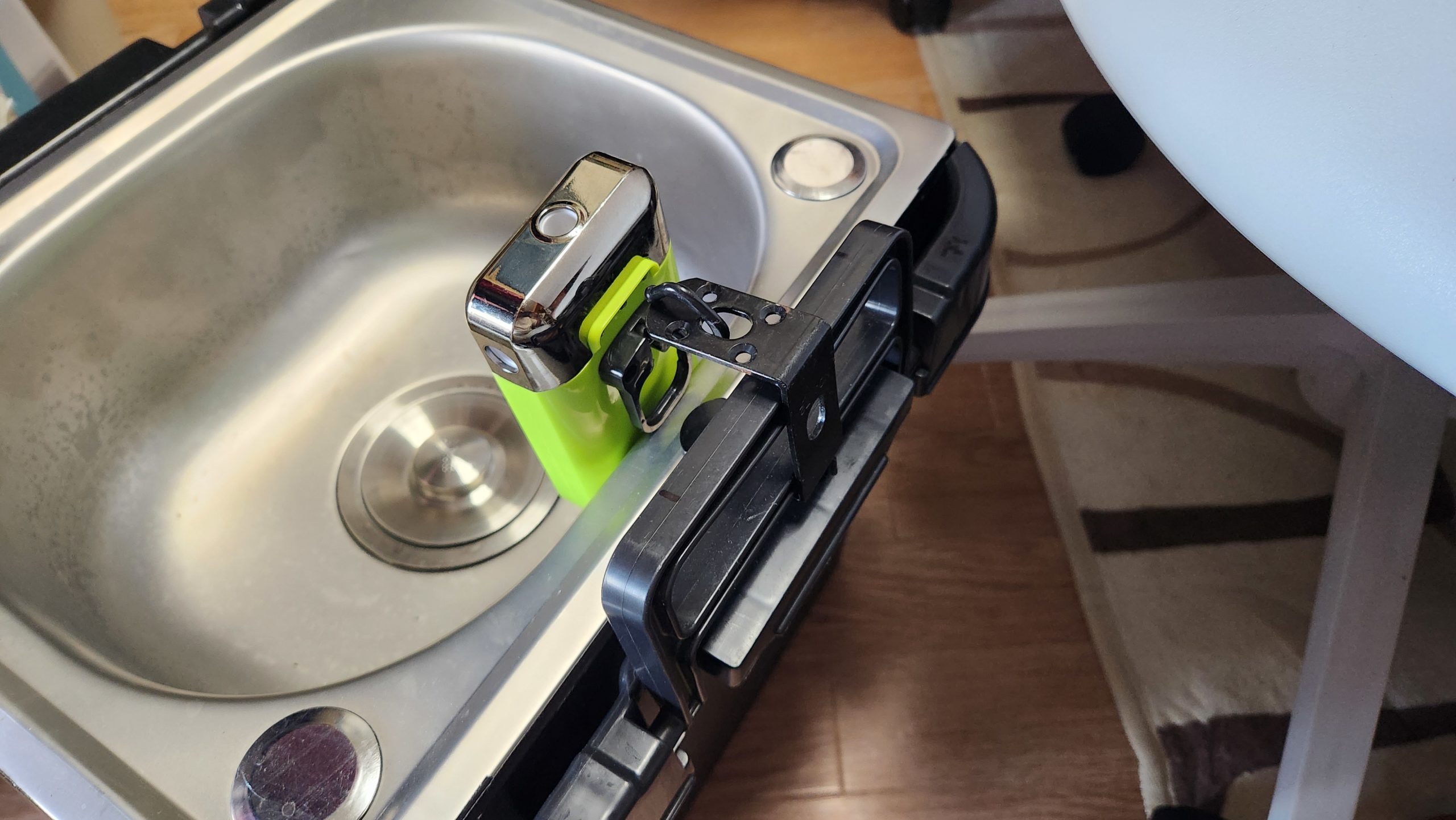 今度の金具は幅が合ってケース内に潜り込む形で、ポンプの重さによってケースに押し当てられる形です。良い感じに引っかかり、シンクとケースの隙間からははみ出ることができないサイズとなっていて飛び出ることはありません。これで使用時の振動でも動くことはないでしょう。(動いても金具の範囲内です)
