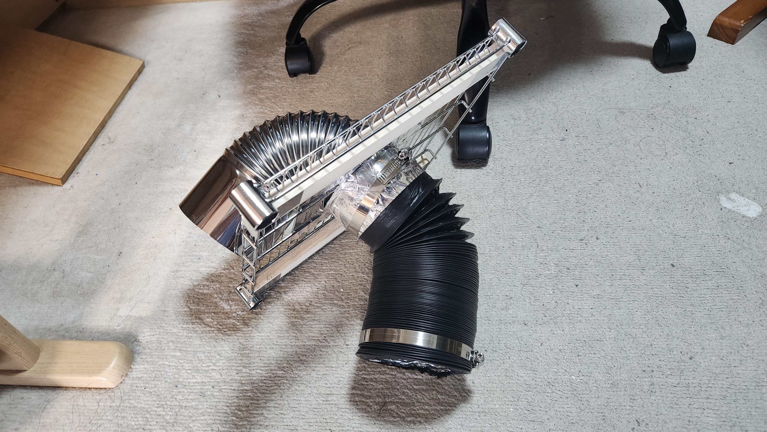 それからサーキュレーターと煙突の曲げ90度。これらは家で余っていたヤツです(煙突はキャンプ道具でお試し購入して使わなかったやつ。1000円です)