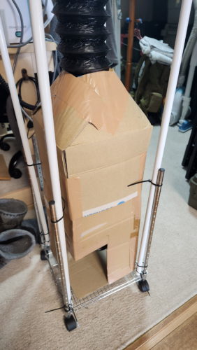 あとはサーキュレーターからホース(ダクト)へ空気が漏れないように手持ちの段ボールで筒を作り、おいてガムテープで固定すれば完成です。