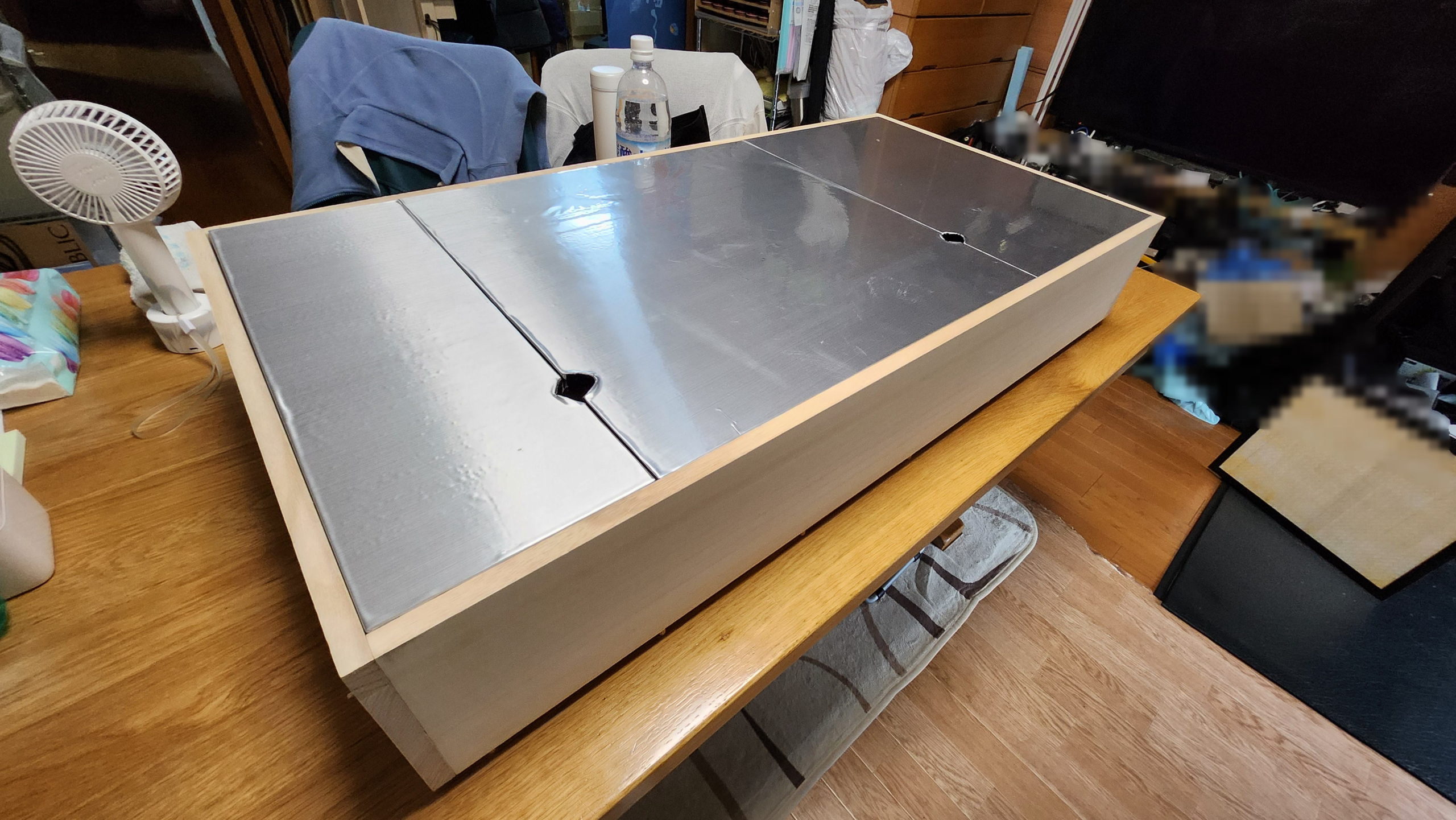 基本的な加工は板のカットだけなので、あとは板を外す(蓋を開ける)時の指穴を設けておきましょう。といってもドリルで大きめの穴、今回はφ25mmの穴を空けるだけです。お好みの位置に空けましょう。カットしたt頃はヤスリ掛けとかテープを貼って触っても問題ないようにしておきます。