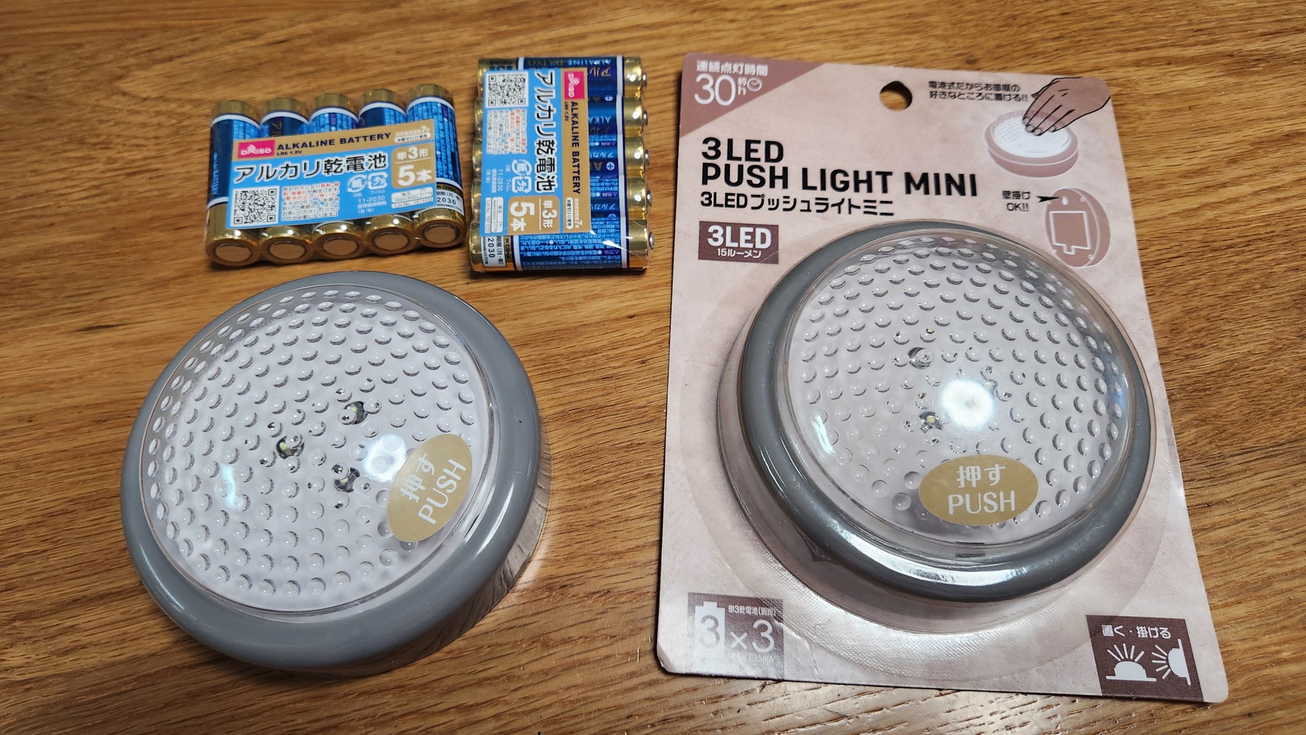 一番手頃なのはプッシュ式スイッチの乾電池式照明です。100円ショップでも売られていますので超手頃です。用意してみました。