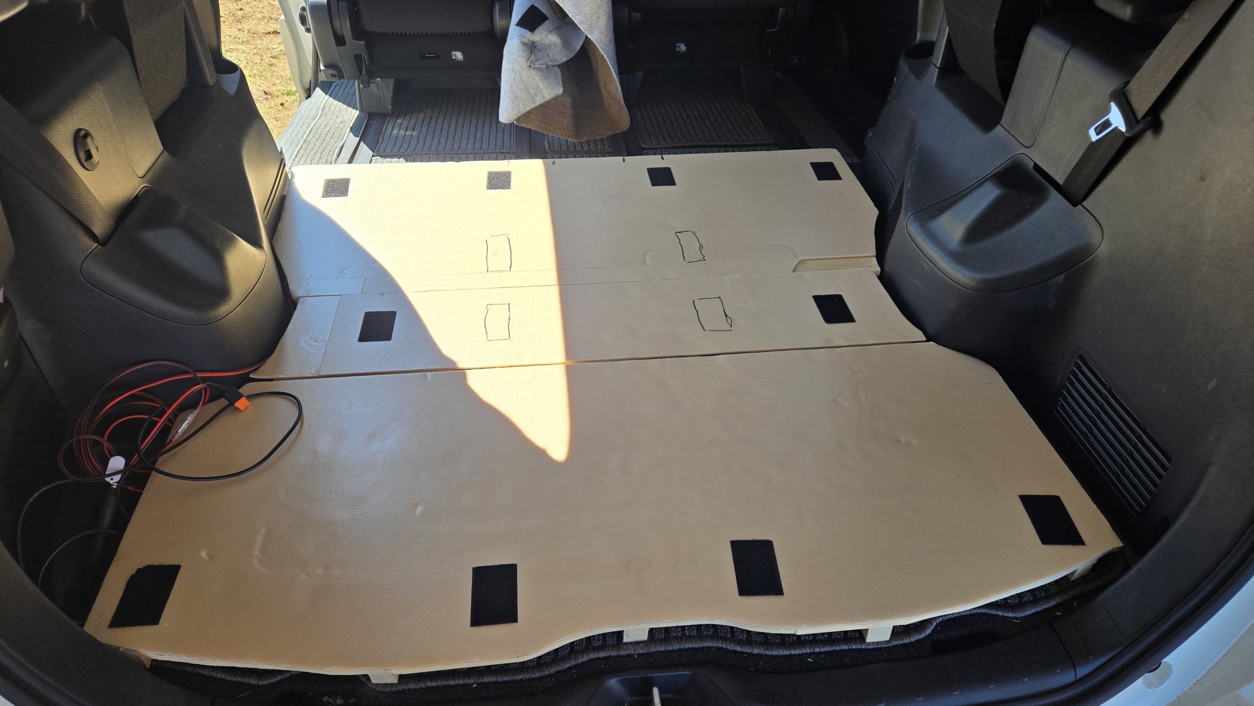 一番はサードシートを使うパターン。いつもは折り畳まって壁面にへばりついている椅子。これが足が出てきて床のクランプにガッチョンとくっつきます。とりあえずゆっくりと下ろすとどこに設置するかがわかります。で、絨毯を外したすのこに印を入れます。どうやら片方で2つの四角部分のエリアをカットすればOKなようです。