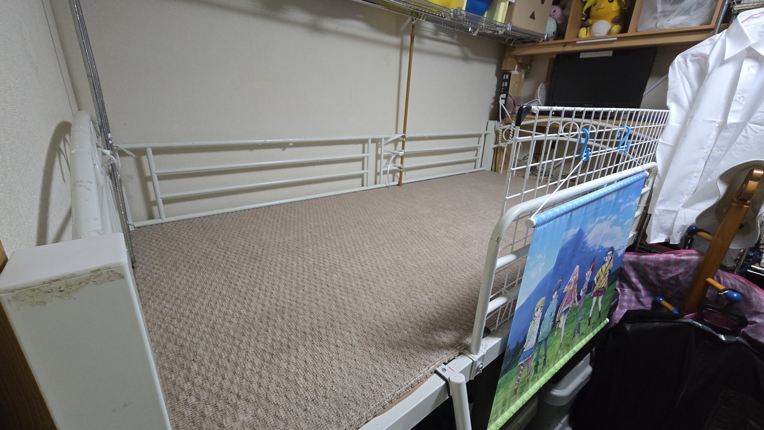 ロフトベッドの下にはφ25mmのワイヤーラック(キャスター付き)を3つほど用意してキャンプ道具一式を収納(それでも足りないけど)しており、上のベッド側には以前からみきんちょが使っていたマットレスがありました。