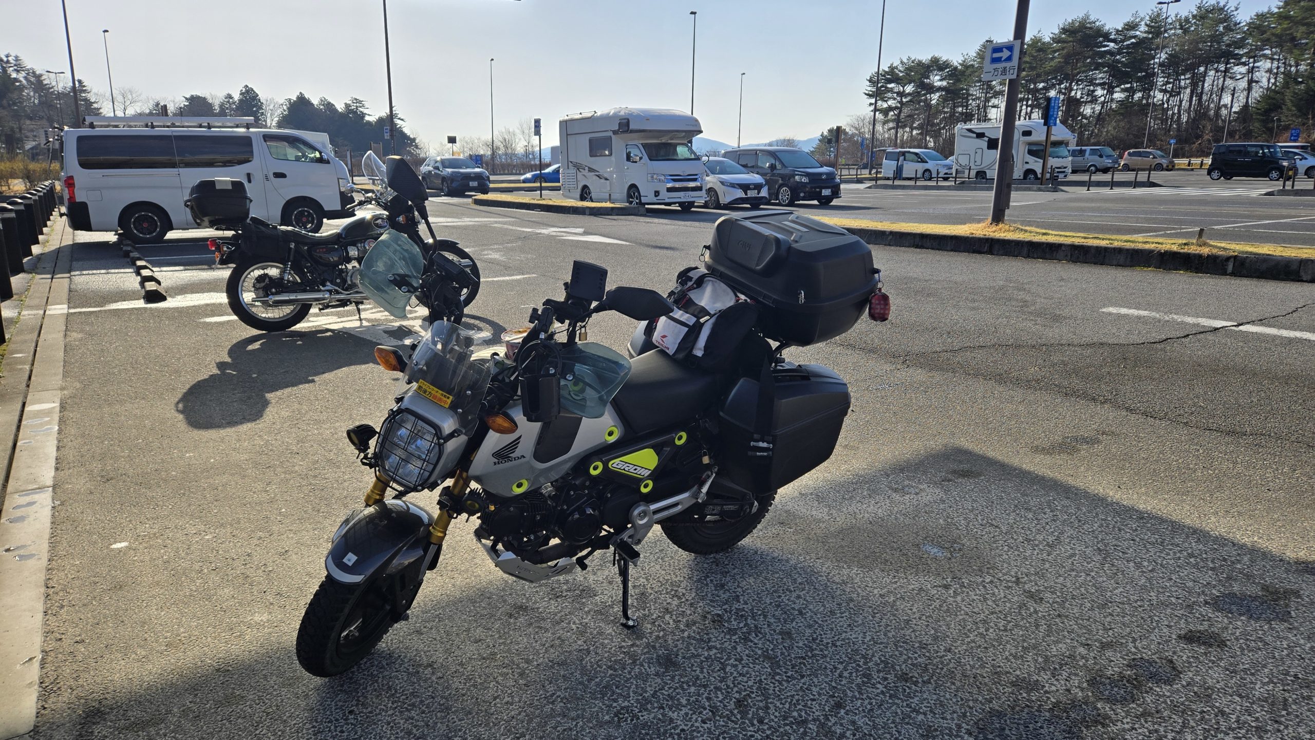 山中湖を時計回りに進み、国道138号で篭坂峠へ向かいます。峠を越えると静岡県。そして下り。この辺りから日の光の中を進むことになります。しばらく下り続けると道の駅「すばしり」に到着です。気温は・・・5度。直射日光素晴らしいですね。