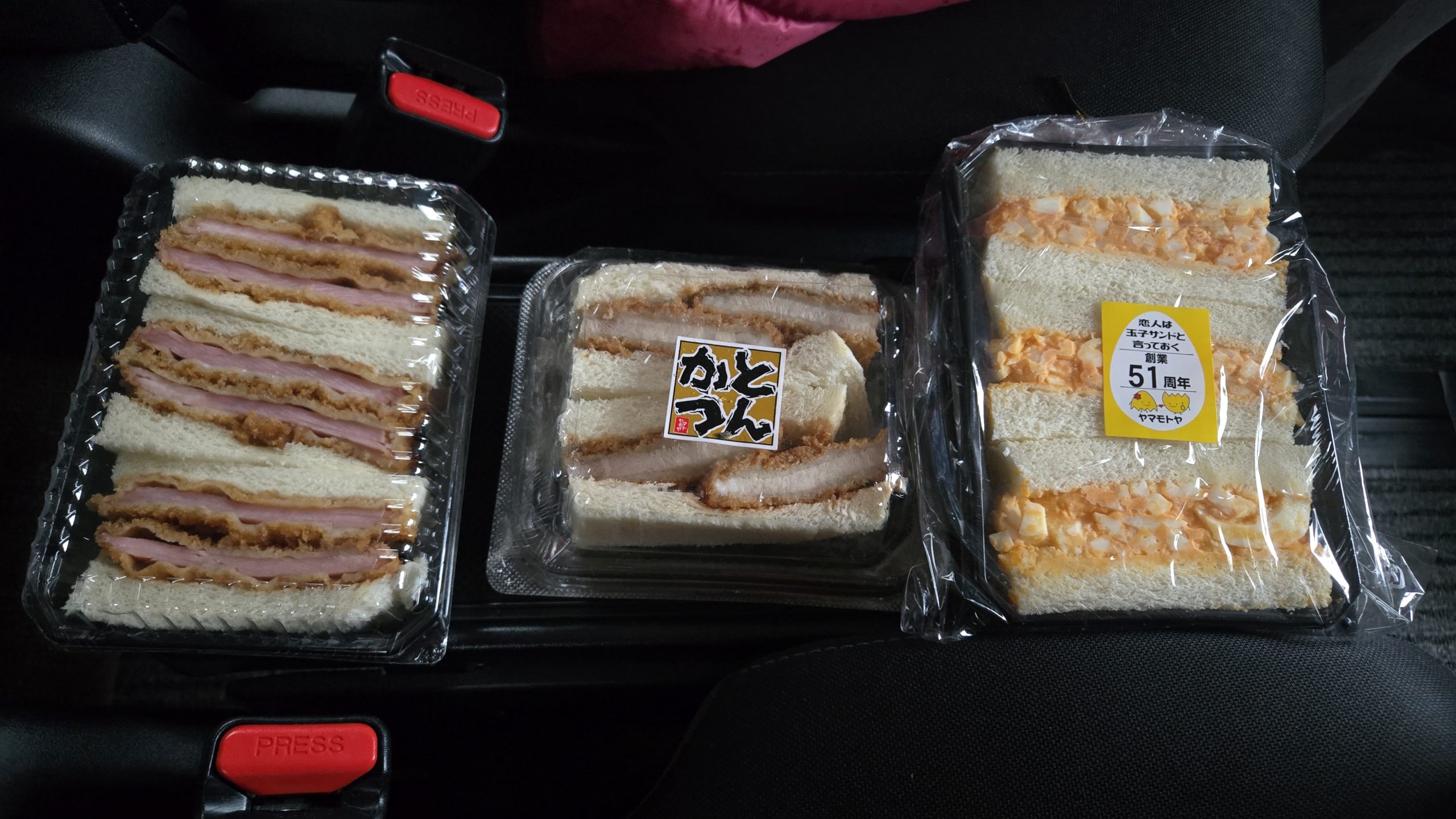 が。デカいのよ。玉子サンド2切れとカツサンド1切れでおなかいっぱいになりましたとさ。あとはお持ち帰りです。車に冷蔵庫装備済みなので使いましょう。安心です。