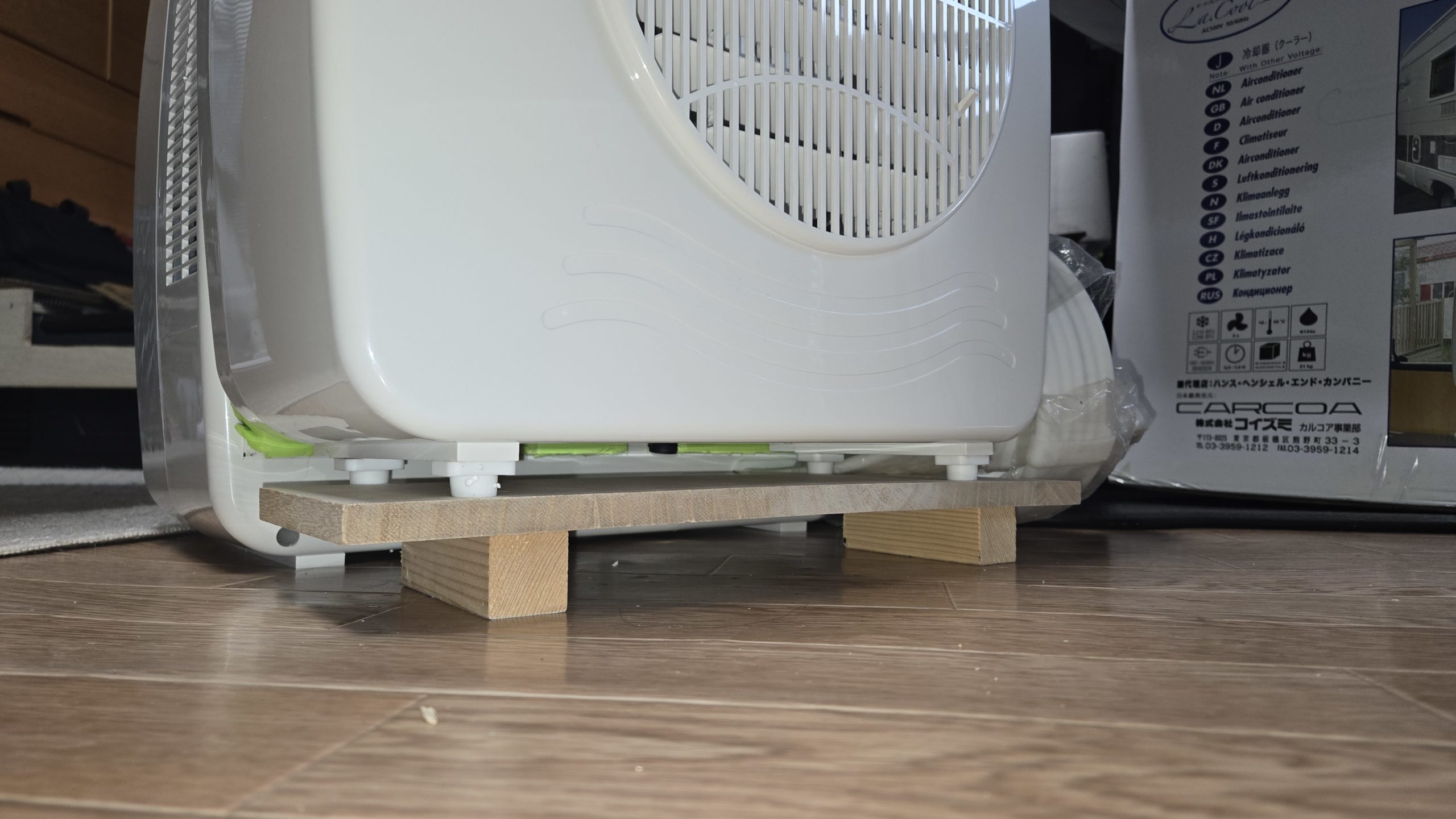 例のスポンジブロックでどうに貸しようかと思ったのですが、室内機の足をみるとサイズがなんとも言えません。それに箱に収納することができるのか?とも思います。そこで、手持ちの余っている端材で下駄を作ってみました。
