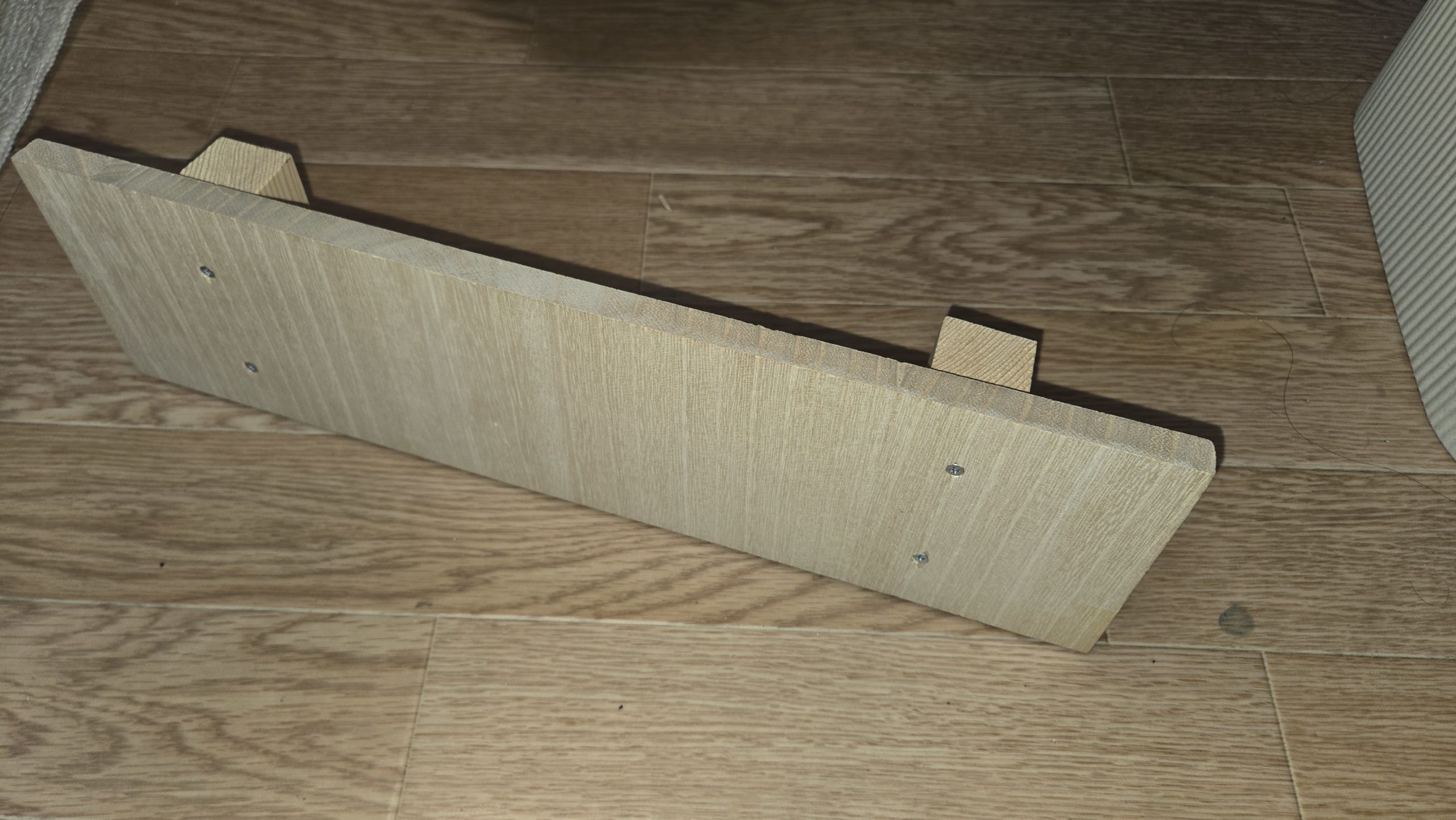 いい感じではないでしょうか。下駄のサイズは、40x12cm。高さは4.5cm(板厚は1.3cm)です。足の間隔は27cmです。このサイズであれば箱の隙間に突っ込むことができました。よーしよし。