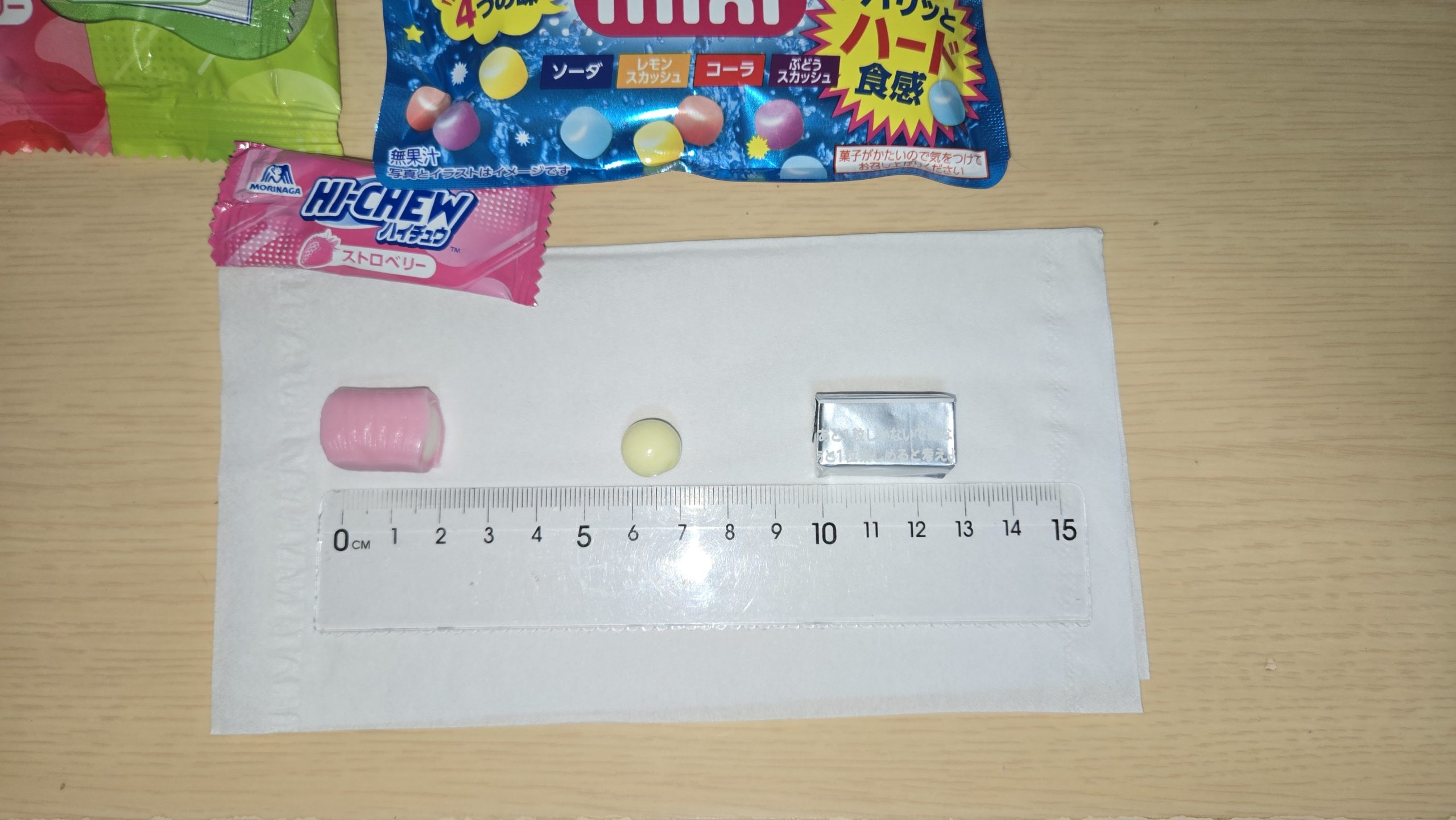 右のハイチュウは昔からのスティックタイプ売りのものです。真ん中のは「ミニ」ですので、まぁこれは参考出品の扱いです。