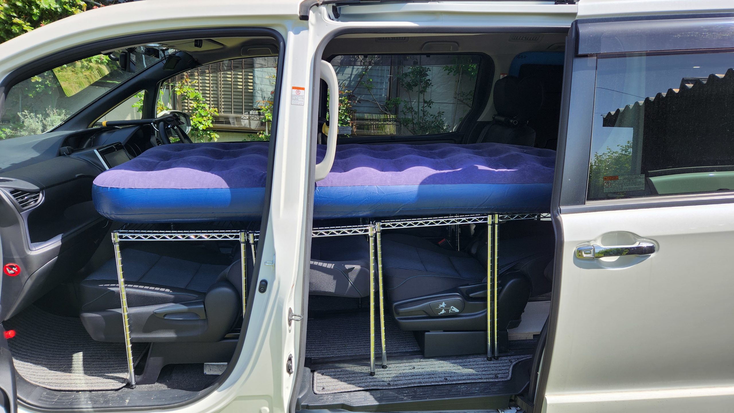 こちらはセカンドシートとサードシートのフルフラットで考える必要があります。というのも、ソロのを2セット用意すれば良さそうではあるのですが、いかんせん運転席にはハンドルがあります。これが非常に邪魔であり、運転席回りには就寝中に触っては危険なスイッチがいくつもあります。運転席は就寝に向かないのは確実です。よって、自動的に運転席は考えから外すこととなりセカンド+サードとなります。片方がそうであればもう片方も合わせておく方がいろいろ効率的です。