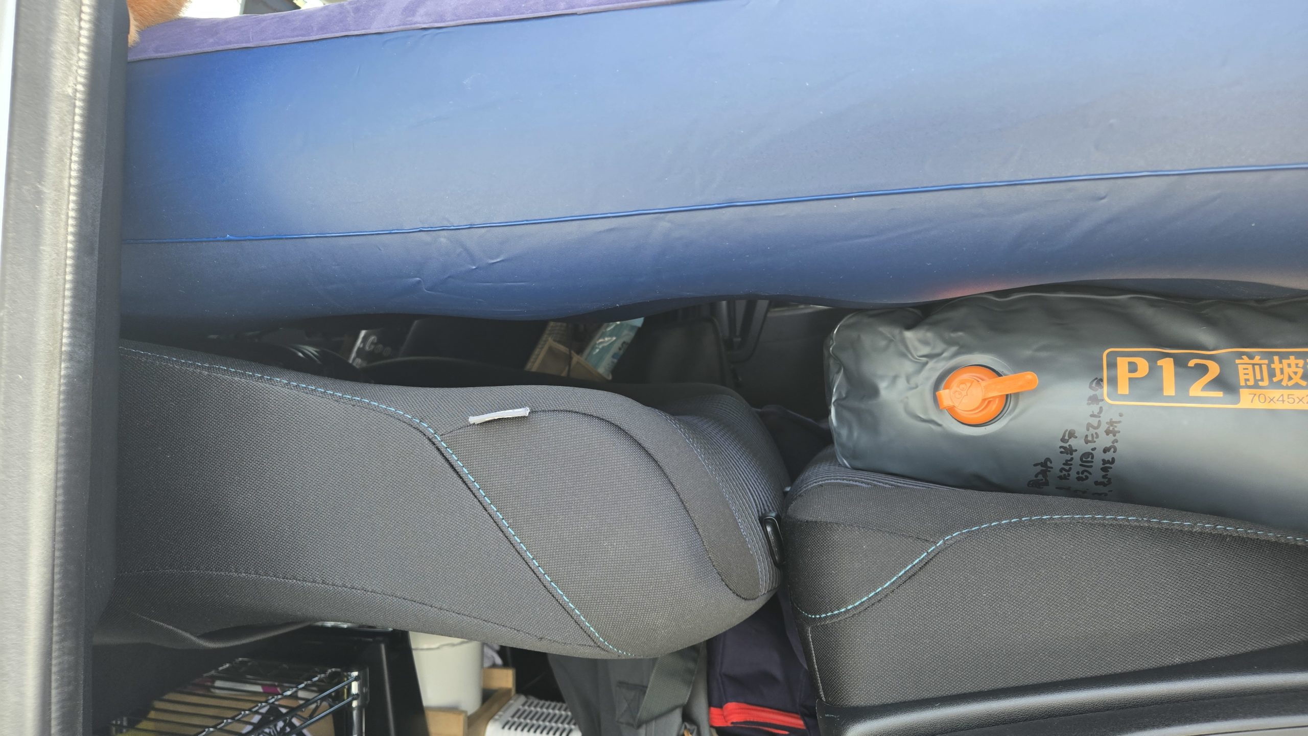 このサイズになるとエアベッドでは吸収しきれず(エアベッドの厚さは約15cmです)、エアベッドが曲がります。助手席側を頭にすると体操で『逆くの字』の背筋伸ばし状態になり、寝るどころの騒ぎではありません。助手席側を足にすると、今度はセカンドシートの座面部分のへこみが沈み込み、『逆への字』状態が完成します・・・