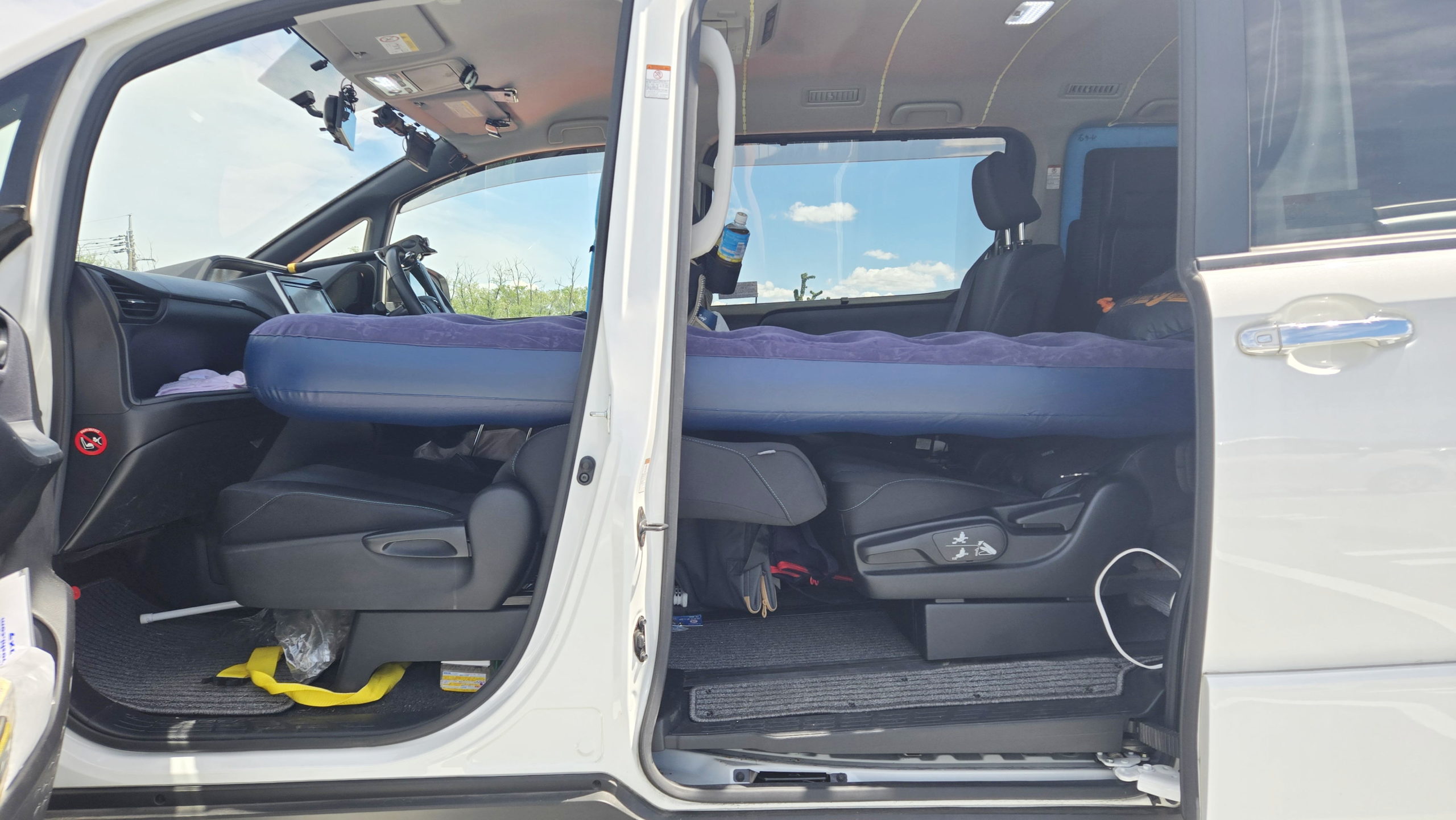 助手席の背もたれ部分にエアベッドが載っている状態で、セカンドシートの背もたれにも載っています。ここは良いのですがそれぞれの座面部分に大きな空白地帯があります。特に助手席側の空間が大きく、背もたれの厚さ以上の空間があることが分かります。