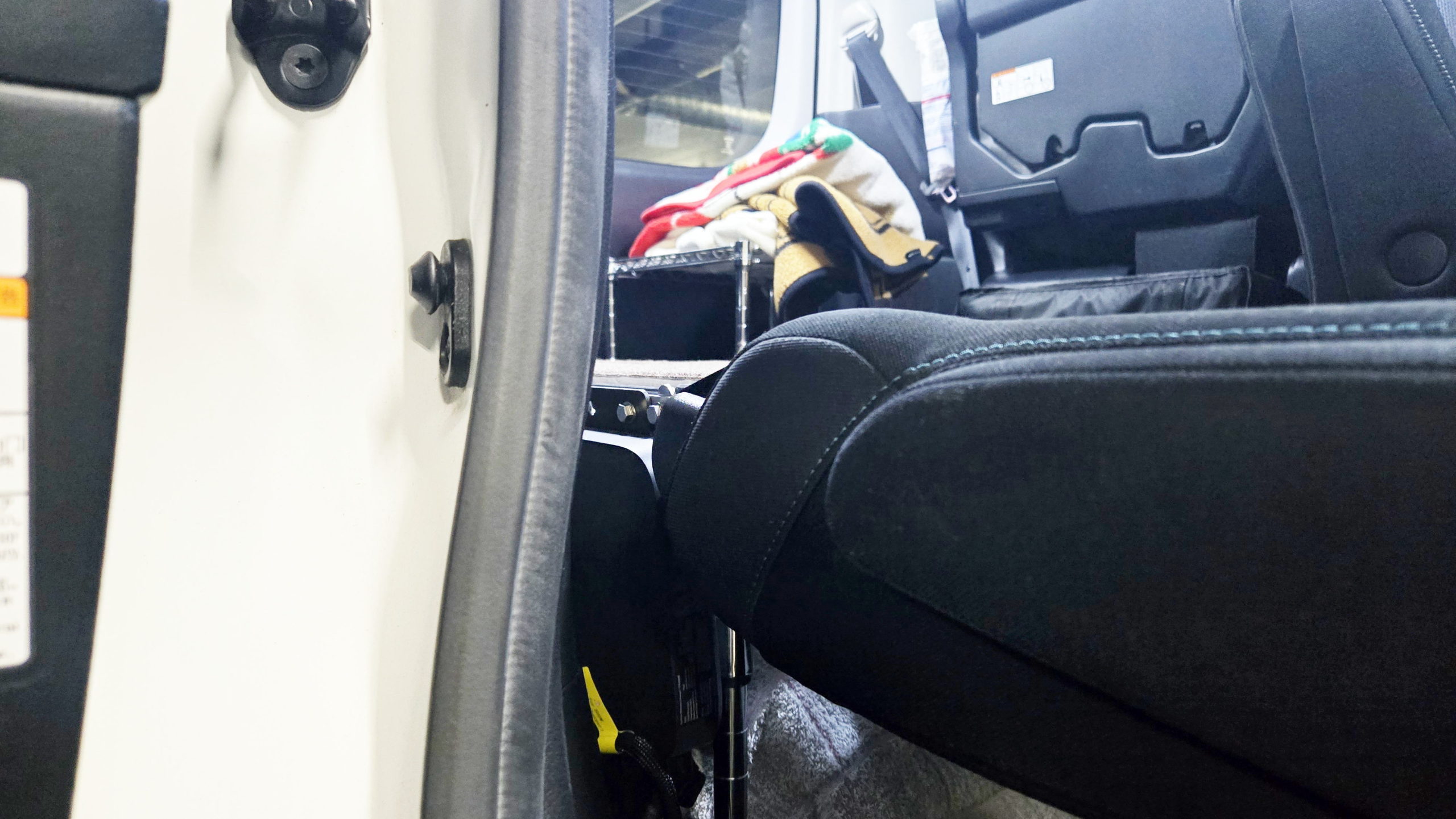 中央にBピラー(助手席とセカンドシートの境の柱)があり、左が助手席で右がセカンドシート(若干右側が尻切れ状態ですが)となります。助手席とセカンドシートは最前方に移動してのフルフラット状態です(セカンドシートは内側にスライドしています)