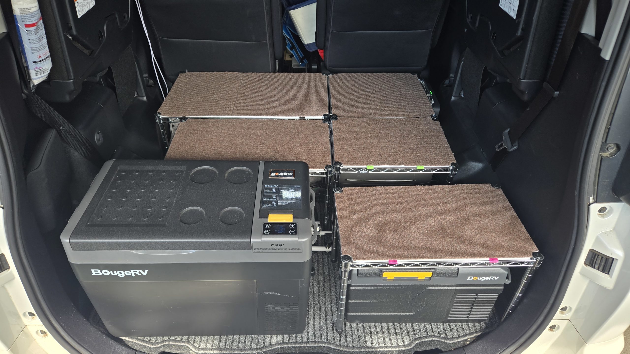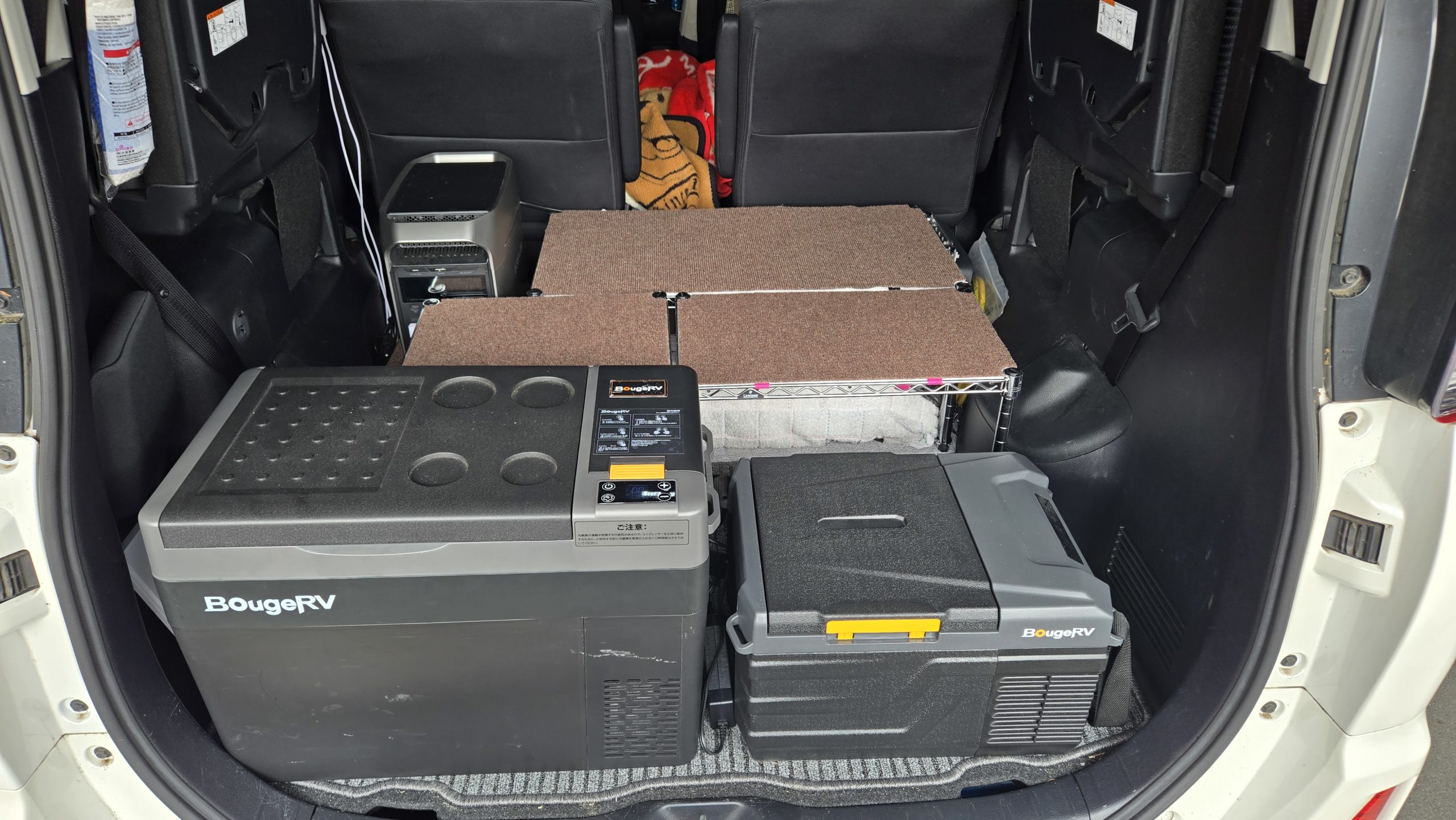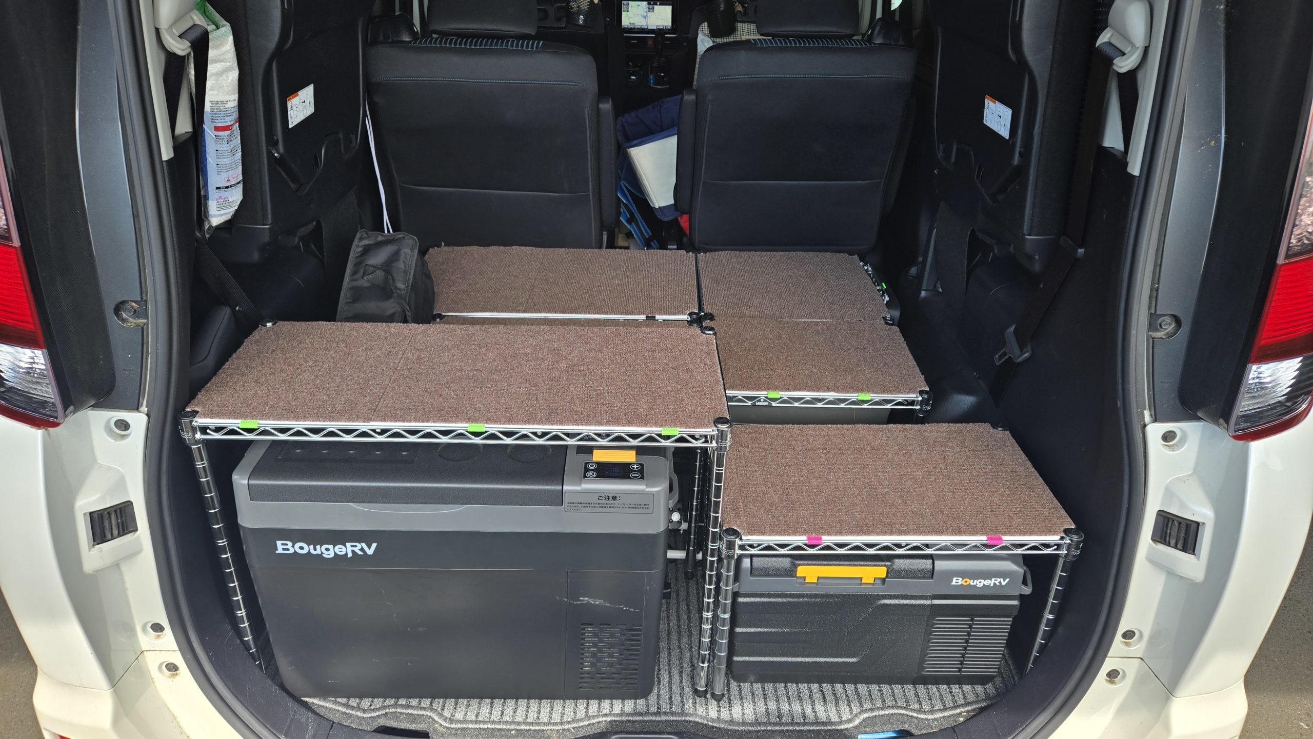 すのこを使ったフルフラットも良かったのですが、ポタ電と冷蔵庫をどうするかという後からの問題の対応として「全部やり直し」という方法と、普通乗用車へ戻せる形にこだわった結果の1つの形がコチラになります。