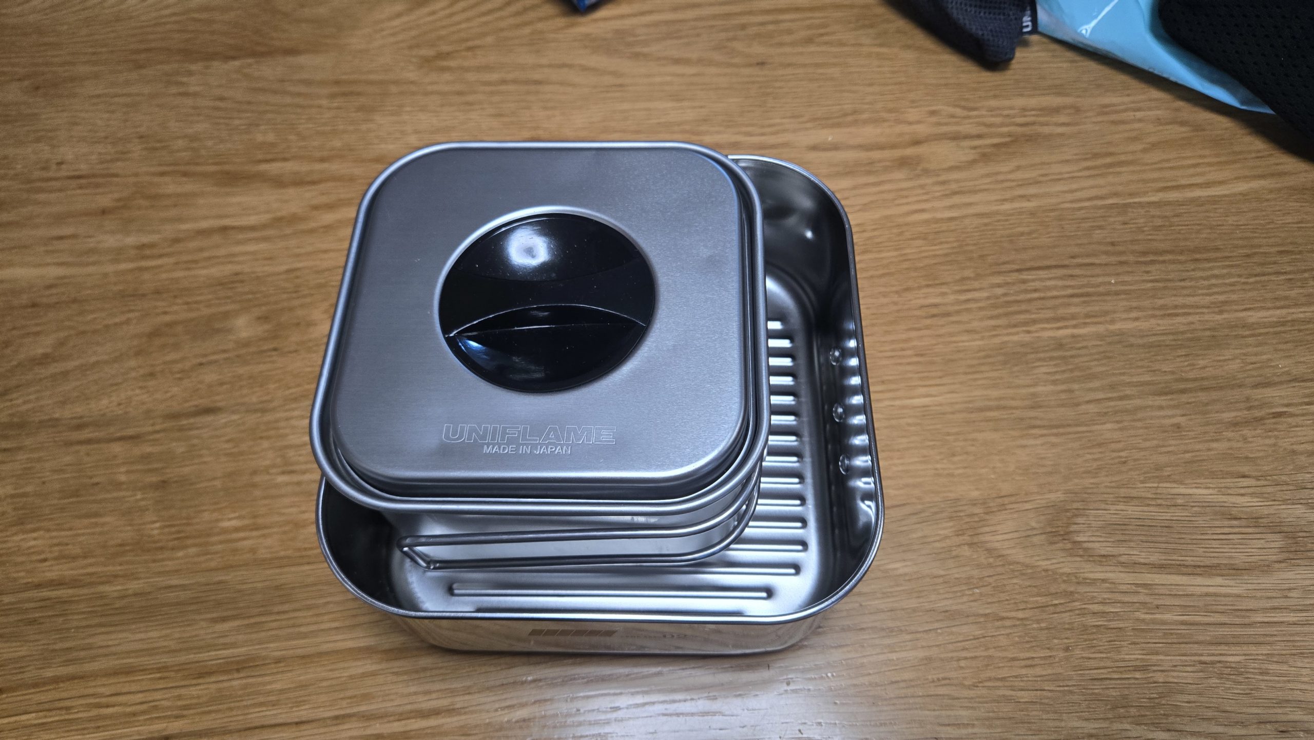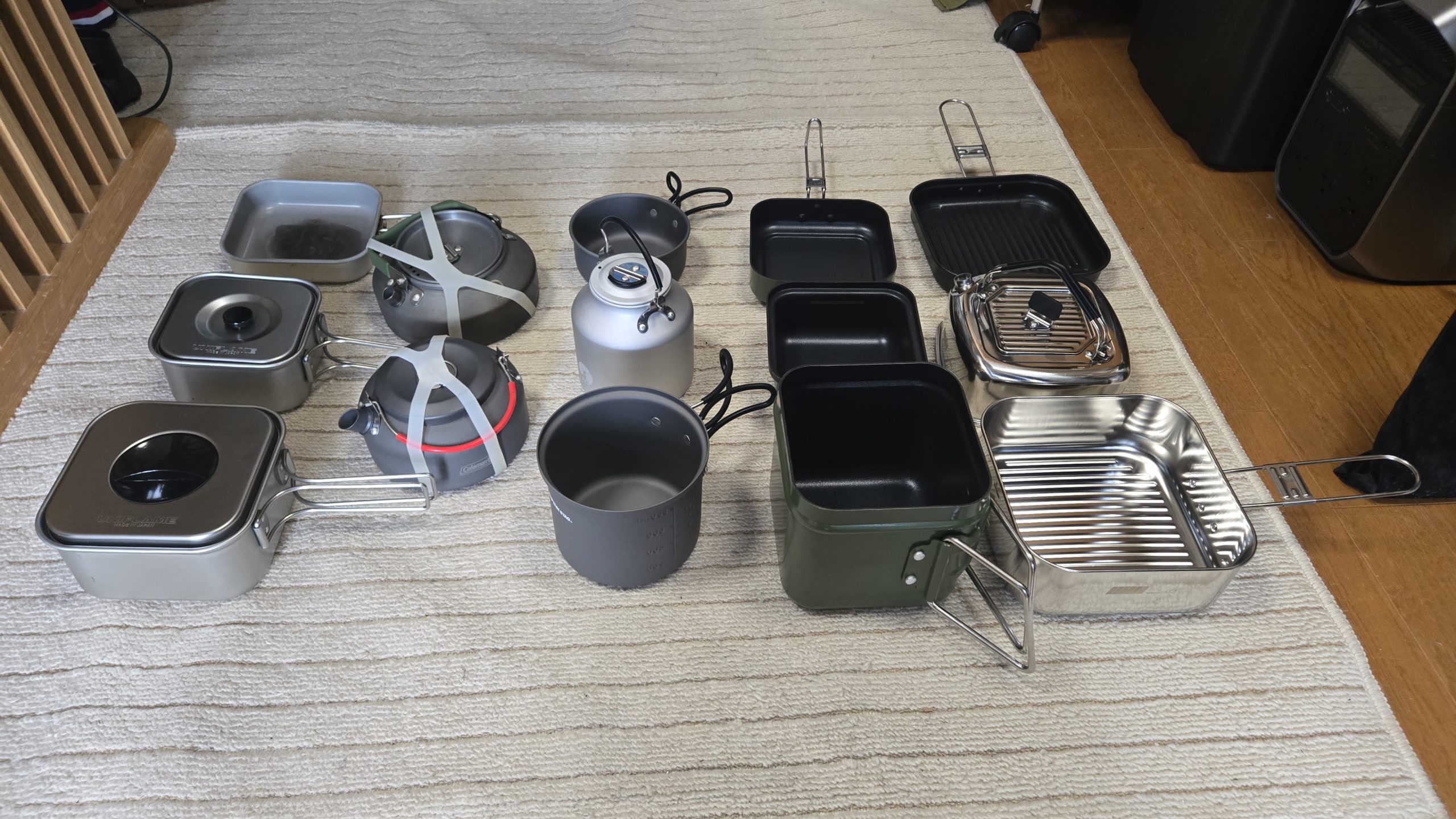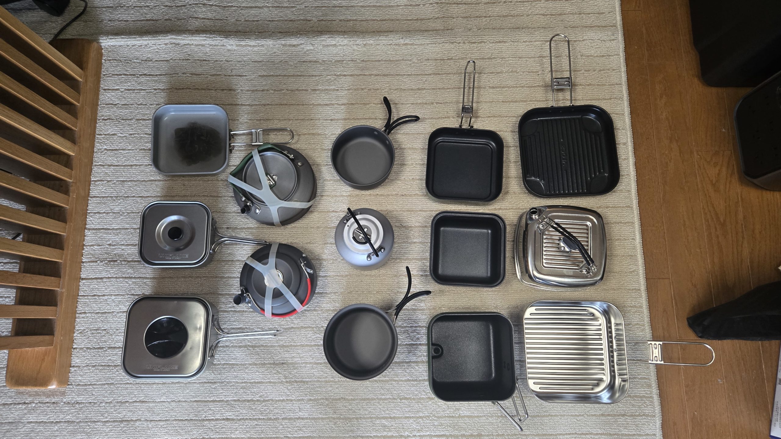 左のUNIFLAMEの山クッカーは、キャンプ当初から利用しているクッカーです。インスタントラーメンが作れるのは必須だろ。ということで、購入当時はほかにないオンリーワンな角形クッカーでちょっとお高いです。