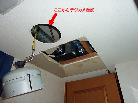 デジカメやビデオカメラの映像では、奥にコンクリ。そのほかは垂木だけという感じで確認取れました。奥のコンクリから手元まで。それと本体の手前から手元まで。この長さをメジャーで測り、そこから本体置くまでの寸法を仕様表からもとめてコンクリとの差を計算すると、約10cm程度のようです。狭っ。しかも間に垂木も入っているようです。
