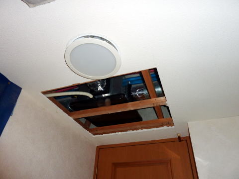 で、作業継続。垂木のところに時々ネジ留めがあるので容易には外れないです。でも石膏ボードは使わずに発泡スチロール系の軽い素材で蓋を用意しようと思っているので、石膏ボードはバラバラでOK。ネジを適当に外したりなどして取り曲げて(破壊して)穴開けです。最初にカッターをズボッと4辺すべてにいれてあるので、容易な作業です。(とはいえ、それなりに力は必要ですし、白い粉が飛び散ります)