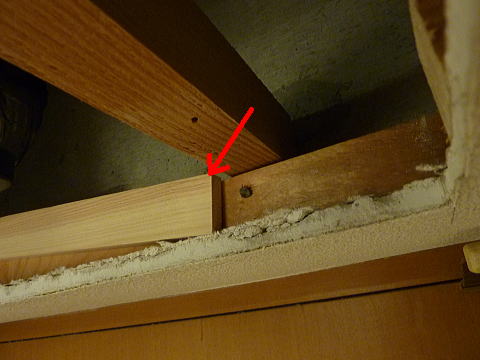 手前側は先ほどカットした垂木を据え付け(位置変更)直すことで枠木をこしらえて、奥の方は1cm位厚みが欲しかったので薄い棒をあてがいます。決して石膏ボードだけで支えるようにしてはいけません。そして外枠を今用意した固定材にネジ留めとなります。