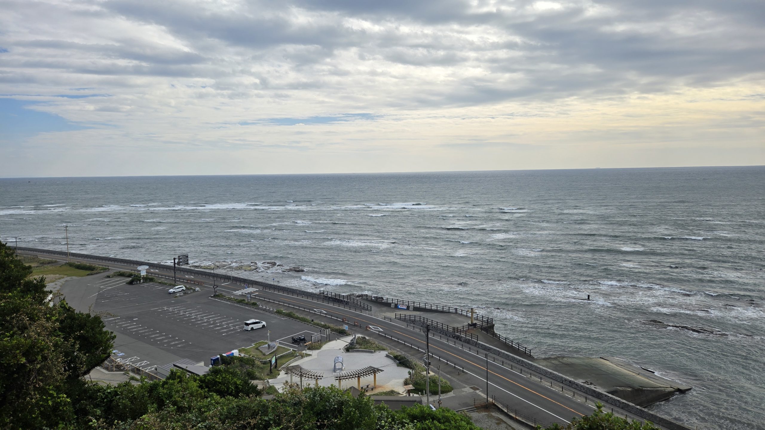 12時頃、お店を出発。ここで国道1号で西へ向かいます。自動車専用道路の浜名大橋を渡るためです。天候が良く(晴れてきた)橋の上からの湖西市の海岸線は一目見ておくに十分な絶景だから。途中、この先の給油は難しいと判断して多少早めですが満タン給油。これで帰りまで余裕で持つはずです。で、浜名大橋へ。橋は地上からかなり高い位置まで持ち上がり太平洋もキラッキラ。そして湖西市の海岸線(写真は以前のものです)