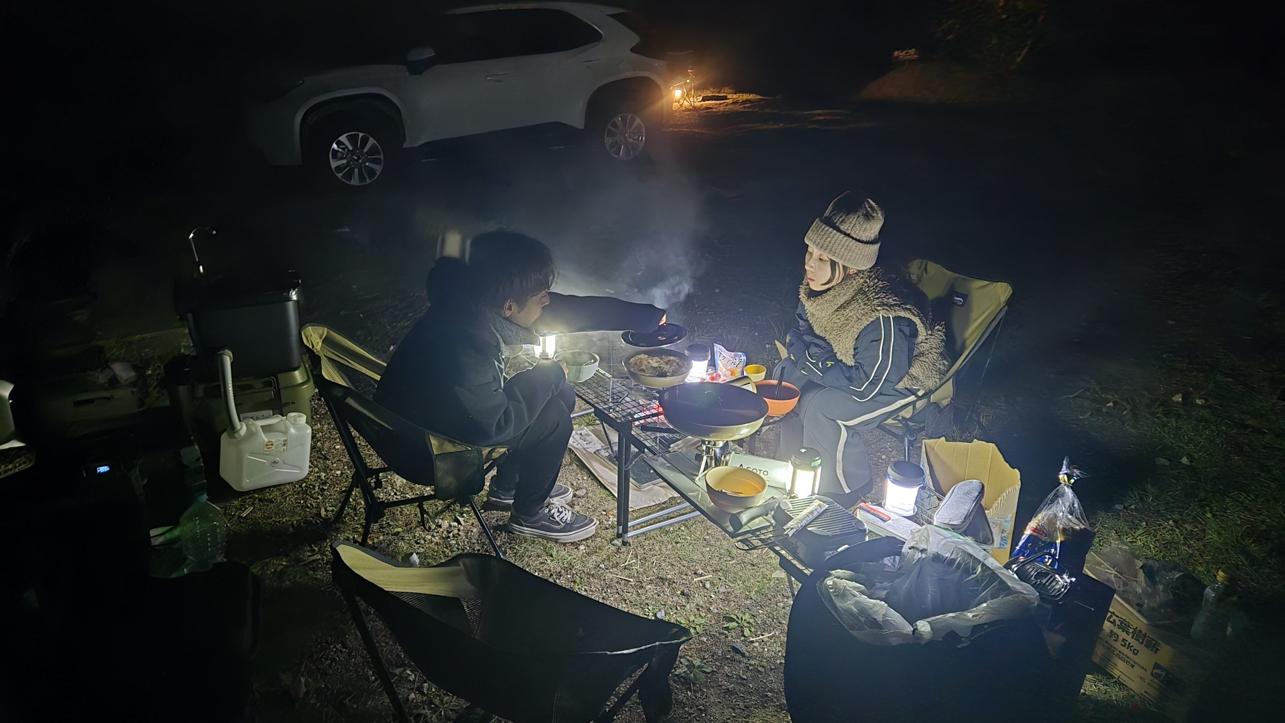 とりあえずお湯を沸かしポットへ。(このポットは飲用ではなくシンク用です) なお、最寄りの炊事場は凍結防止のため17時から使用禁止とのこと。少し離れた(100mくらい)炊事場なら給湯器完備ですが使い勝手が悪い。そのための自作シンク発動。というわけで、そのシンクのためのお湯です。容量は4リットル。2リットルほど沸騰させて2リットルの水でぬるま湯へ。大体45度くらいの4リットルが完成となります(水は炊事場から汲んできても良いし、水のペットボトルでもOK)。このポットは保温性がありますが冷えても行きます。朝方には30度くらいにはなっているでしょう。必要なら沸かし直せば良いので楽ちんです。それよりも手元に炊事場が用意できるという利便性は計り知れません。やはり「可搬式シンク」は大正解です。まだ数回しか運用してませんが効果は絶大です。絶対にオススメ。(ちなみにグレータンクは5リットルのポリタンクです) 外・車内・テント内と使う場所を選びません。