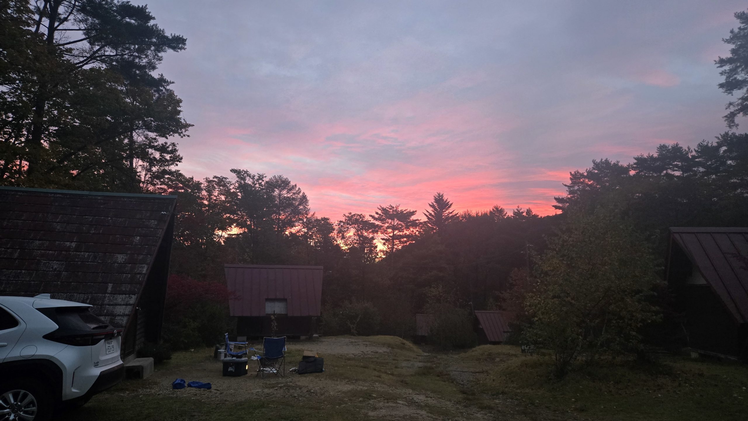 さて、ちょっとキャンプ場の散歩でもしようかなぁ。と思って服を着ます。で、外に出る。気温は5度。あまり変化していなかったようです。寒いは寒いけどまぁそんなもんかな?って感じ。朝焼けがキレイです。