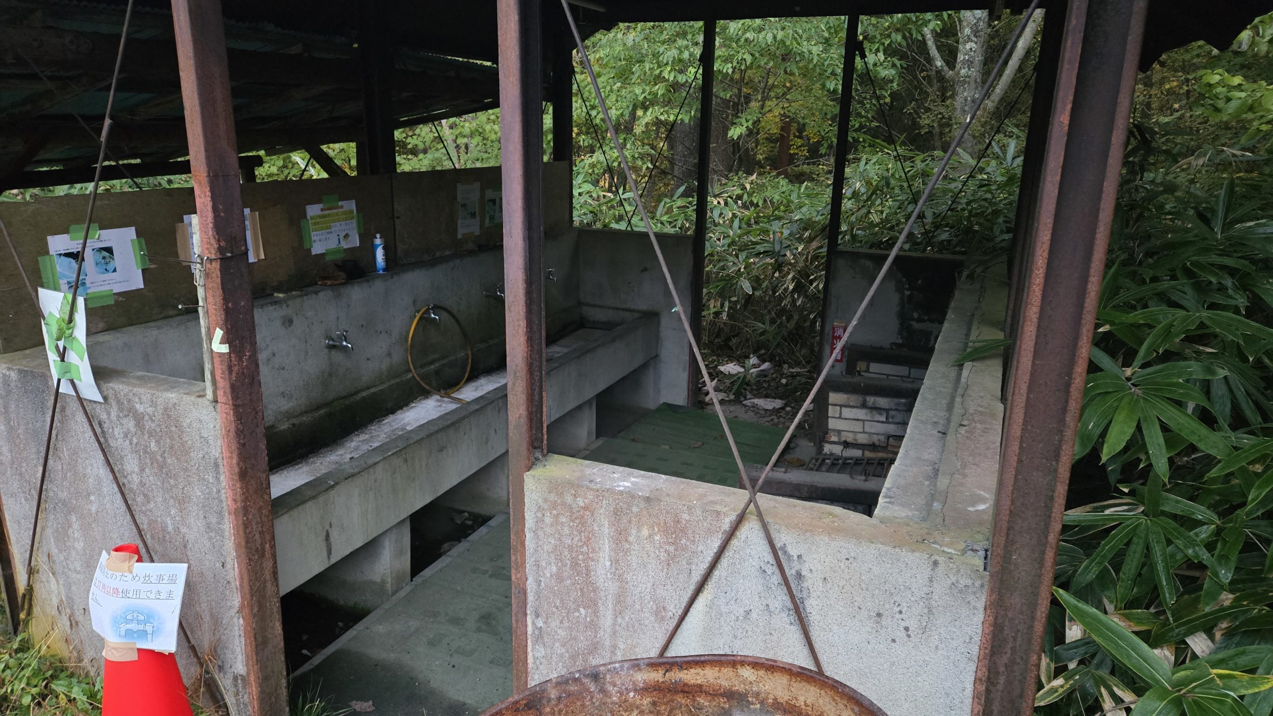 と、ここでポンプの電池切れという事態発生。盲点だった・・・仕方ないのでシンクの栓をしてお湯を溜めての溜め洗い。コレでしのぎます。どのみち仮洗いなので良いでしょう(本洗いは帰宅してから)。