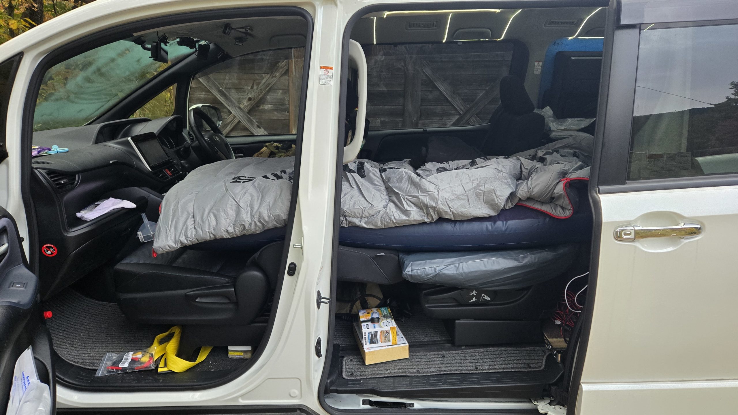 続いて助手席とセカンドシート左を倒してフラット化。椅子の座面と背もたれの段差をエアクッションでそれぞれカバー。その上にセミシングルのエアベッドを置いてシュラフを設置。