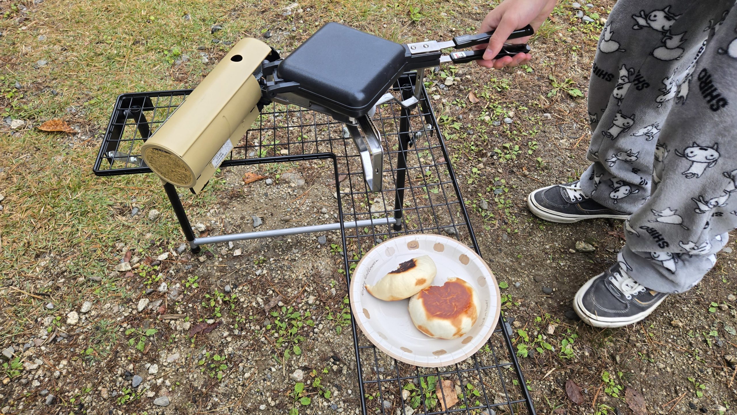 と、7時になりバンガロー組が起き出してきました。朝は「肉まんプレス焼き」だそうです。どうしてもやりたかったんですって。