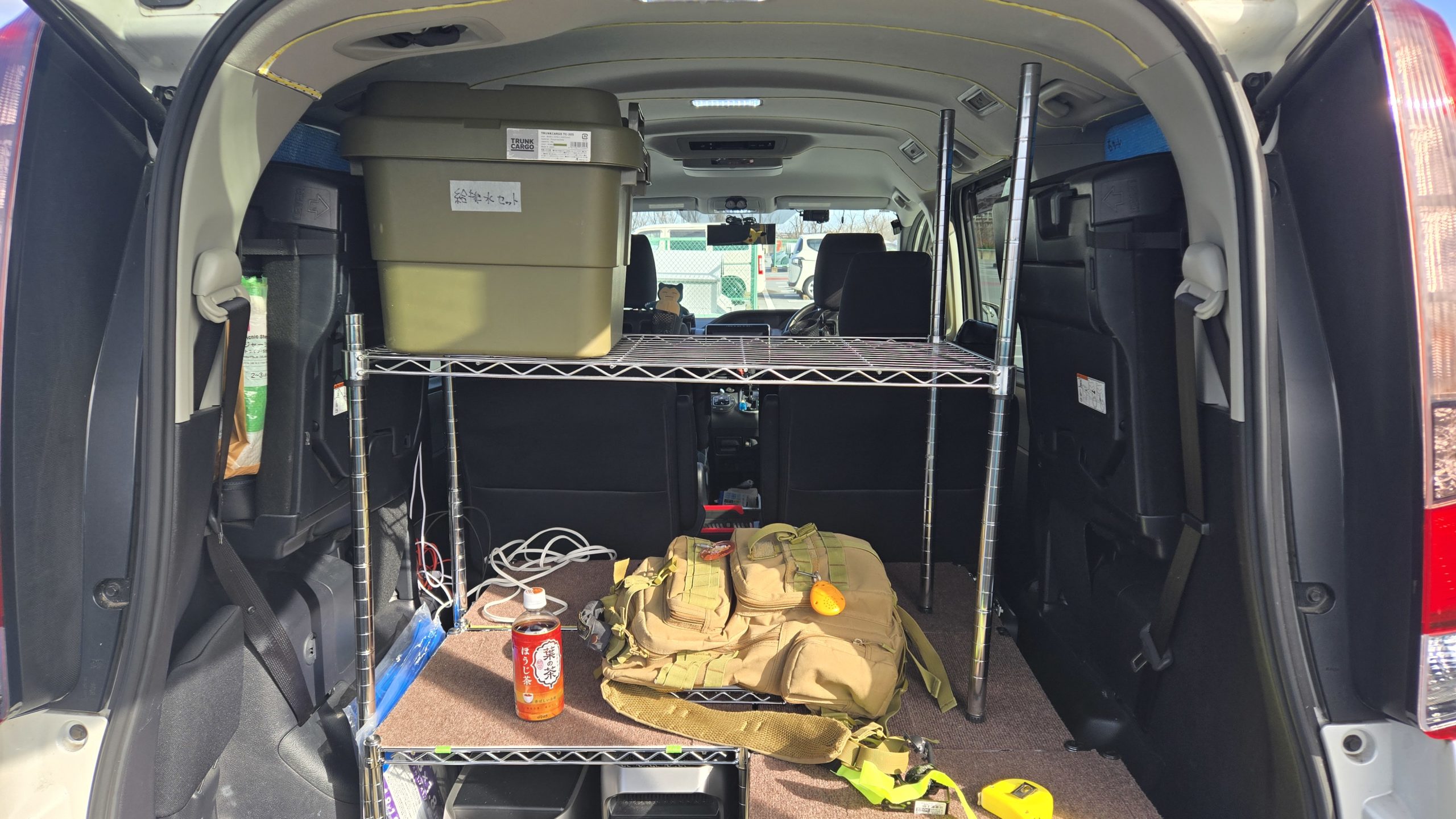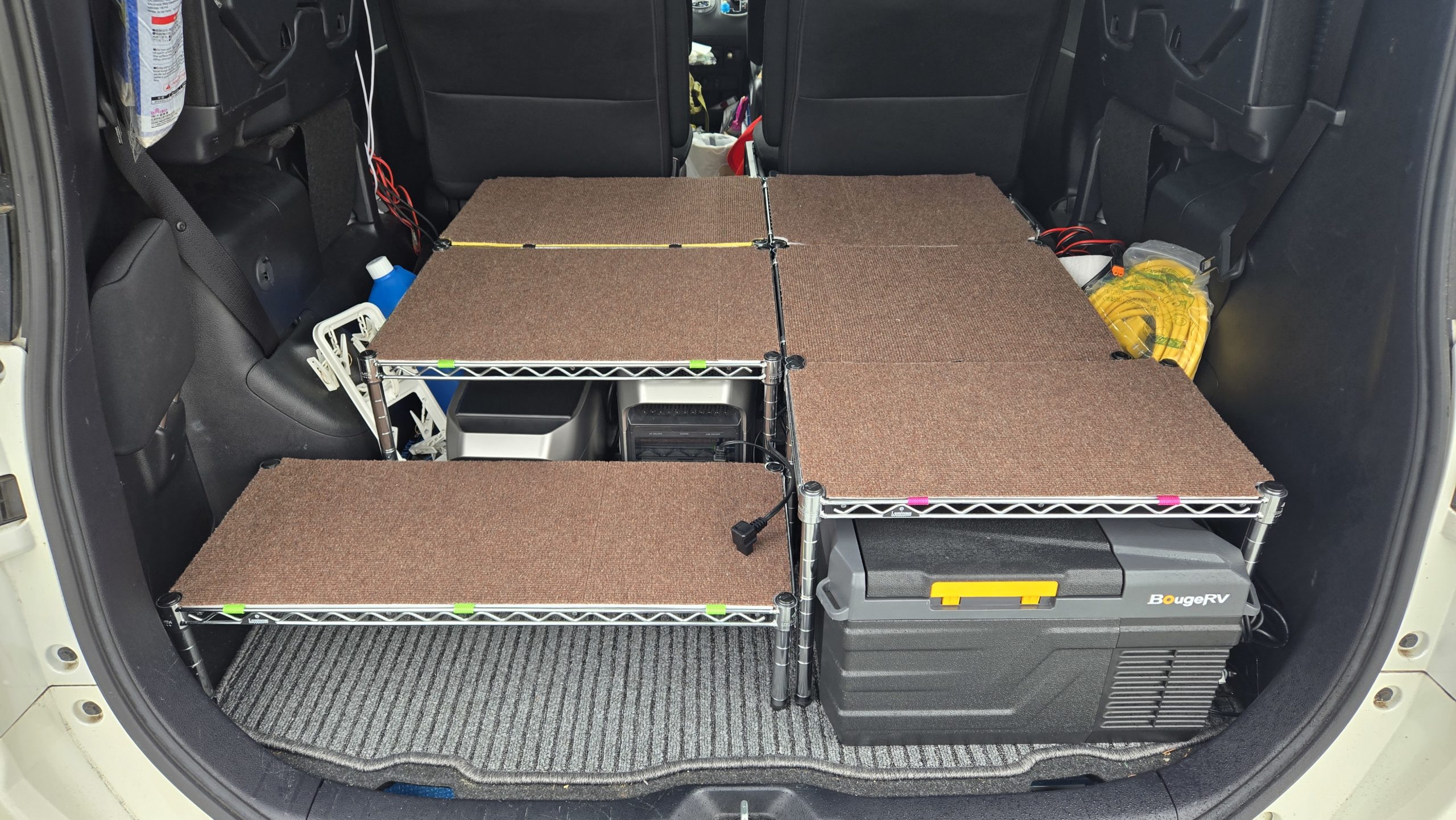からっぽになったカーゴスペースで今回の棚板を組み上げてみます。