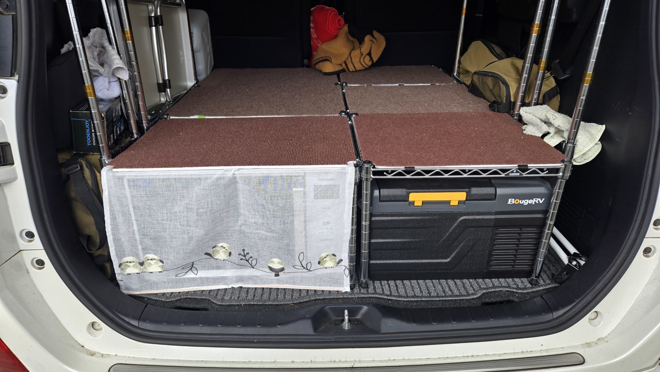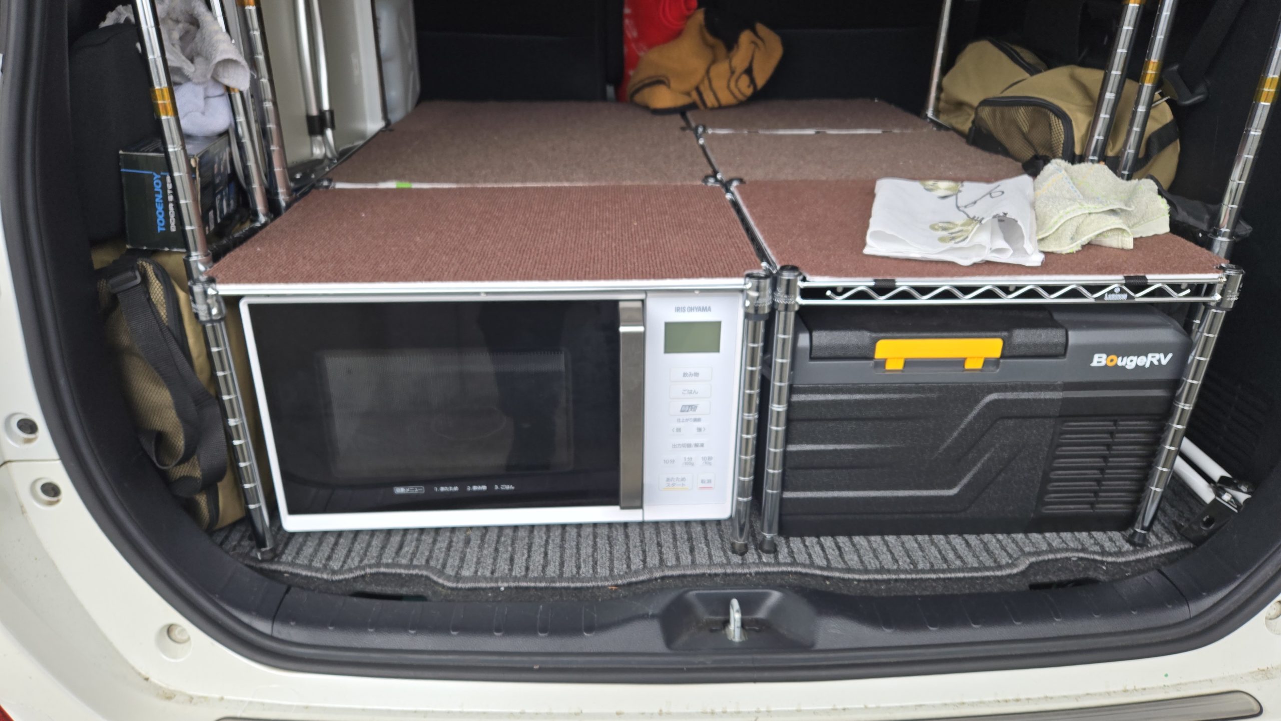 カーゴの床に置かれているのでちょっと気になるんです。食べ物を扱う機器が野ざらしであることが。車内なので野ざらしというと語弊があるのですが、「外界に直接されされている」という点から、「雨に濡れないようにしたい」とか「ほこり、レンジ内に入っちゃわない?」とかが気になります。ドアがダイレクトにありますので。これが天井付近の空中設置ならあまり気にならないんですけどねぇ。